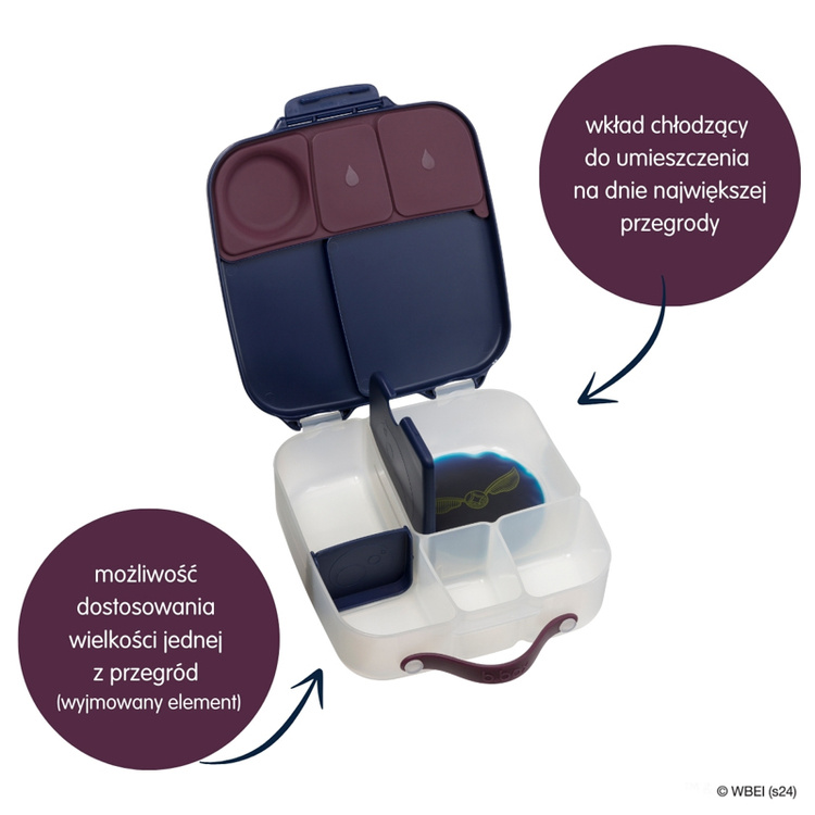 Το φαγητοδοχείο διαθέτει ένα μεγάλο διαμέρισμα που ταιριάζει ένα ολόκληρο σάντουιτς. Επιπλέον, το κάθισμα κάτω από το δίσκο συμπεριλαμβάνει ένα ψυκτικό τζελ για να διατηρείται το φαγητό πιο φρέσκο και πιο δροσερό για περισσότερο.
