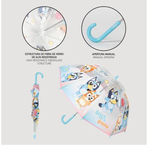 Η παιδική ομπρέλα Bluey συνδυάζει ανθεκτικότητα και παιχνιδιάρικο design, κάνοντας τις βροχερές μέρες πιο διασκεδαστικές. Η διάφανη επιφάνειά της επιτρέπει στο παιδί να βλέπει καθαρά, ενώ παραμένει απόλυτα προστατευμένο από τη βροχή.
