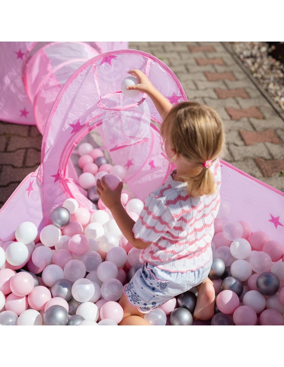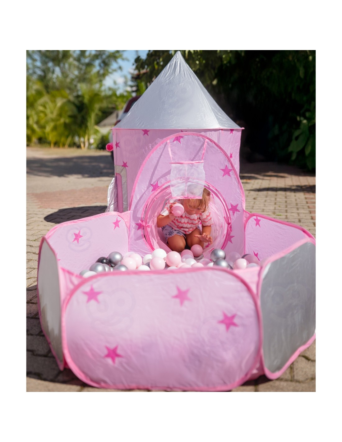 Η πτυσσόμενη κατασκευή επιτρέπει γρήγορη συναρμολόγηση και εύκολη αποθήκευση, κάνοντας το σετ πρακτικό για κάθε οικογένεια. Κατάλληλο για εσωτερικούς και εξωτερικούς χώρους, είτε στο παιδικό δωμάτιο είτε στον κήπο. Η ευρύχωρη πισίνα μπαλών προσφέρει έναν επιπλέον χώρο χαλάρωσης και διασκέδασης, έτοιμο να γεμίσει με χρώμα και γέλιο.