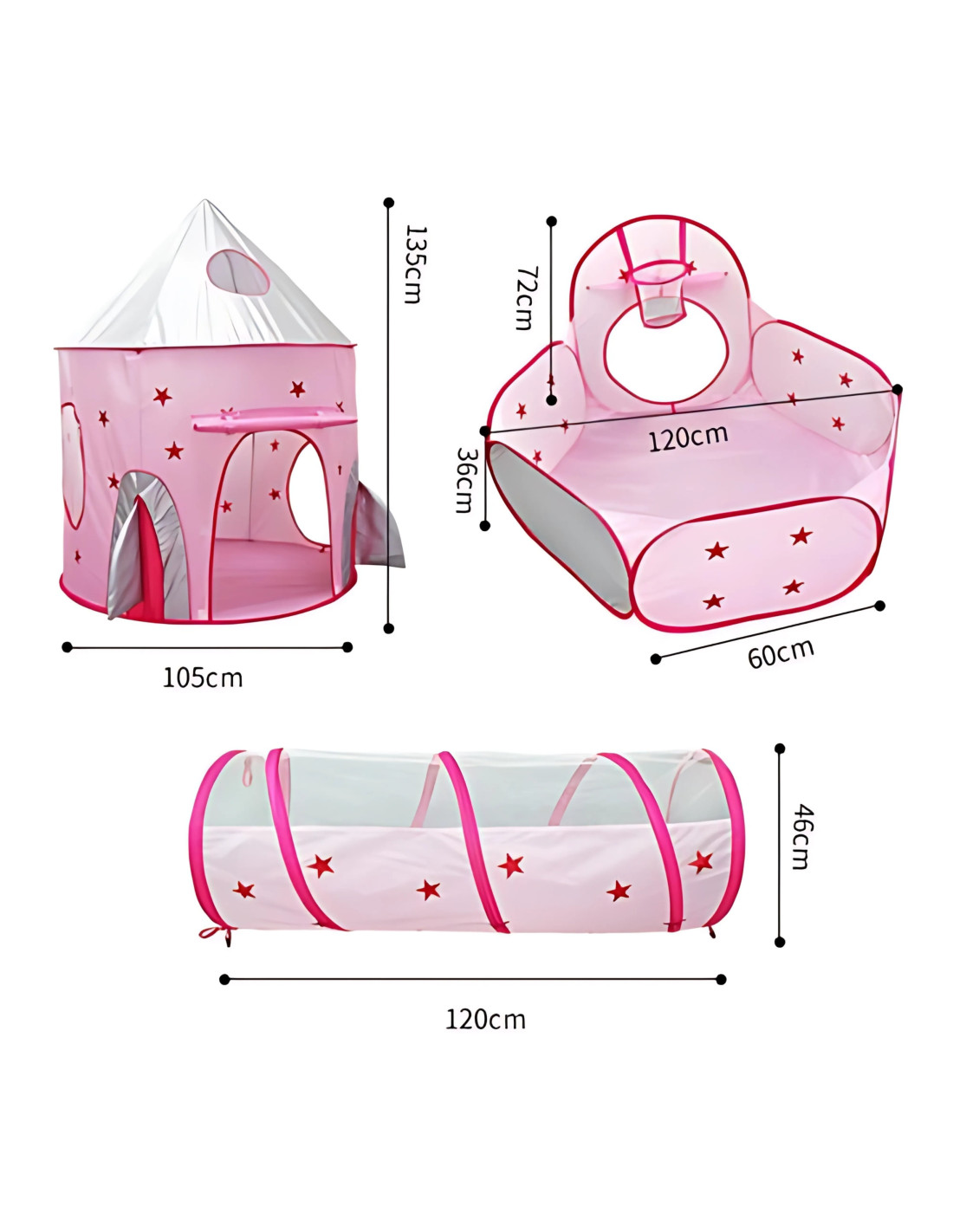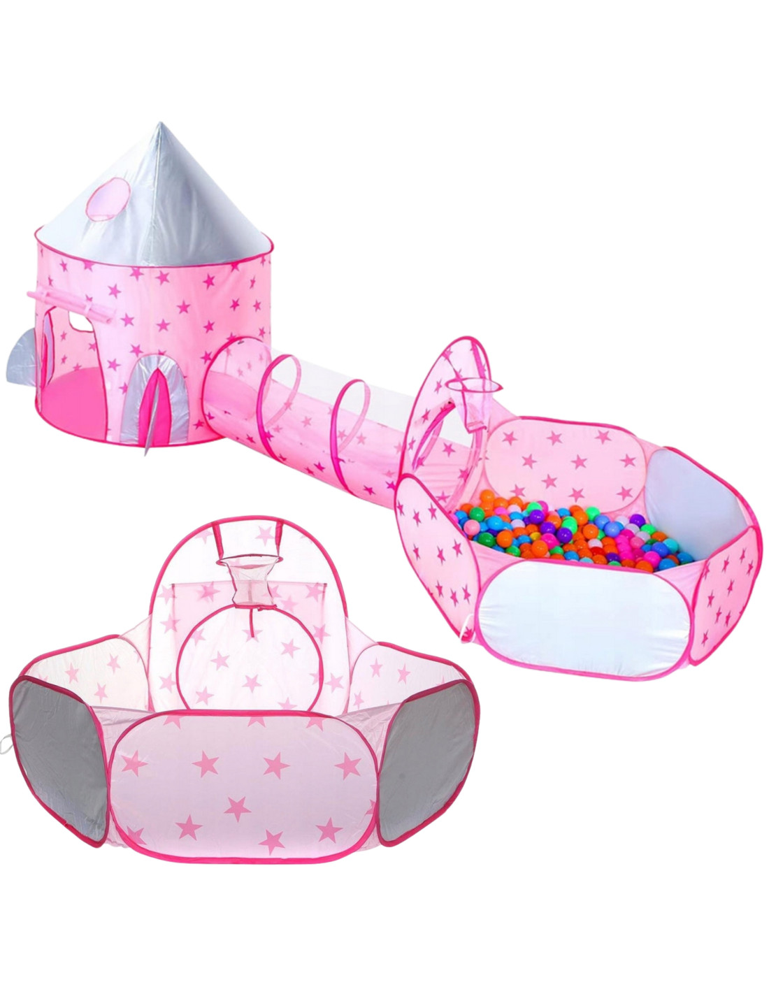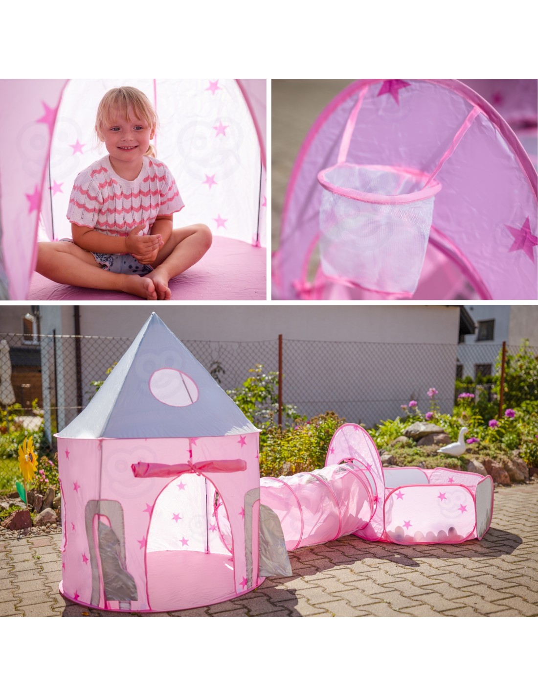 Το παιδικό σετ σκηνή πριγκίπισσας 3-σε-1 Woopie ανοίγει την πόρτα σε έναν παραμυθένιο κόσμο γεμάτο φαντασία! Ο εντυπωσιακός πύργος-κάστρο γίνεται το ιδανικό καταφύγιο για μυστικά, ιστορίες και βασιλικές περιπέτειες. Το τούνελ ενώνει το κάστρο με την πισίνα, δημιουργώντας ένα συναρπαστικό ταξίδι εξερεύνησης που τα παιδιά δεν θα θέλουν να σταματήσουν.