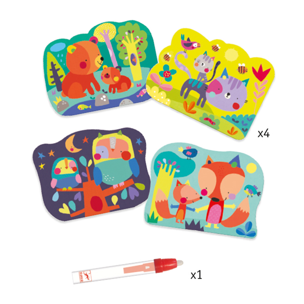 Σετ ζωγραφικής με μαγικά χρώματα! Αποτελείται από τέσσερις καρτέλες με ζωάκια κρυμμένα στο δάσος! Τα παιδιά γεμίζουν τον μαρκαδόρο με νερό κι έπειτα ξεκινούν να χρωματίζουν για να αποκαλύψουν κάθε είδους εκπλήξεις. Όταν ο μαρκαδόρος στεγνώσει τον γεμίζουμε ξανά και ακλουθούμε την ίδια διαδικασία. Κατασκευασμένο από την εταιρεία Djeco, κατάλληλο για παιδιά 18 μηνών και άνω.