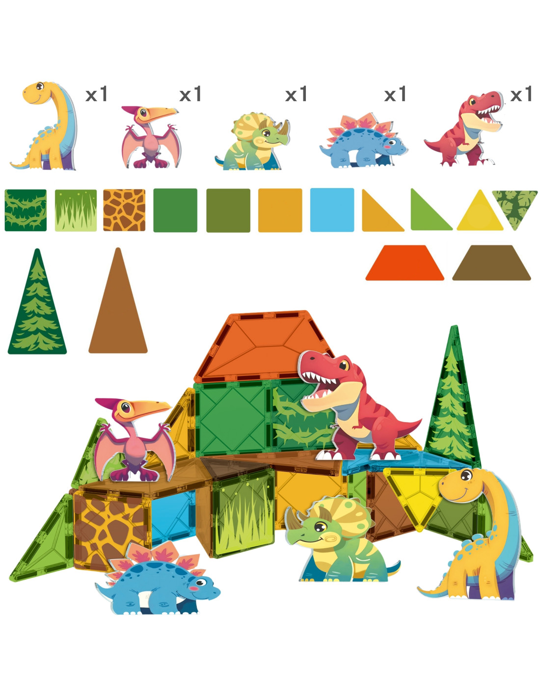 Το παιδικό σετ μαγνητικών κατασκευών ενισχύει τη φαντασία, τη δημιουργικότητα και τη συγκέντρωση. Τα παιδιά μαθαίνουν μέσα από το παιχνίδι, αναπτύσσοντας λεπτές κινητικές δεξιότητες, υπομονή και λογική σκέψη. Οι φιγούρες δεινοσαύρων όπως T-Rex και Triceratops εμπλουτίζουν το παιχνίδι ρόλων και κάνουν κάθε στιγμή πιο συναρπαστική.