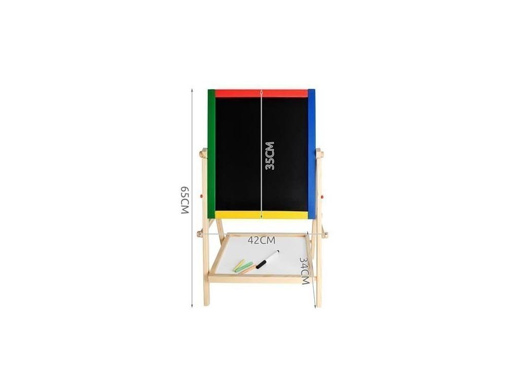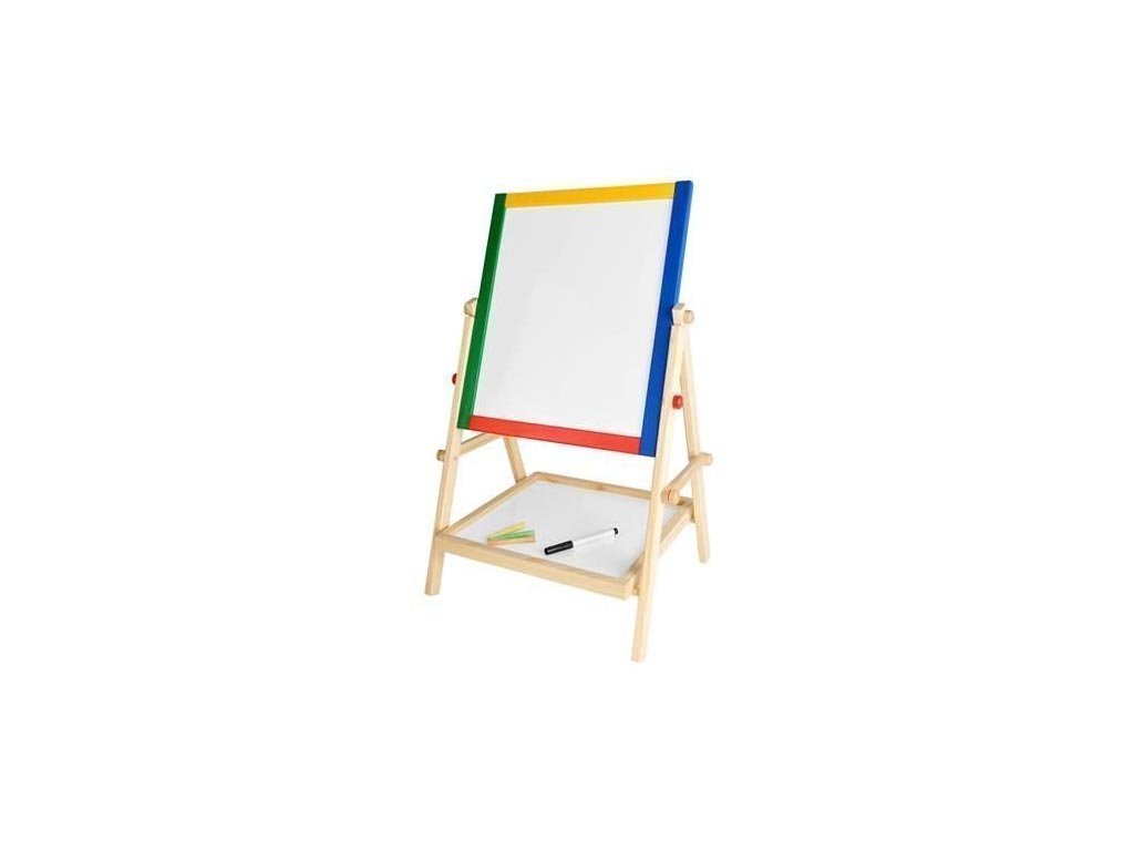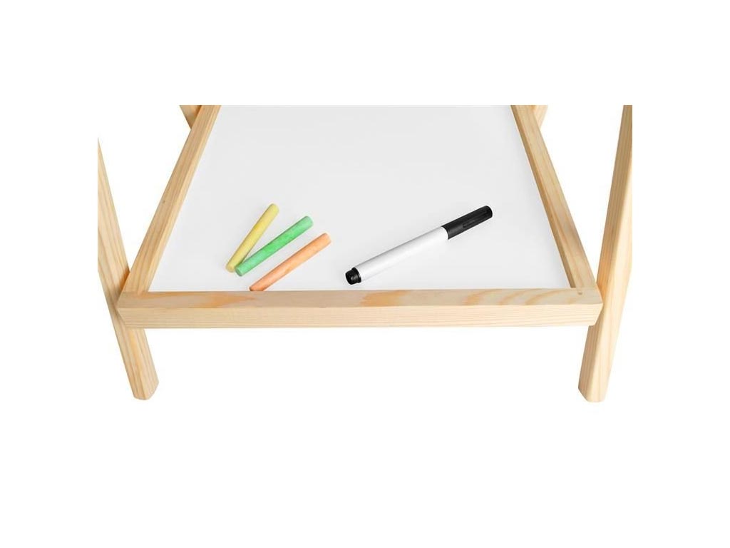 Κατασκευασμένος από εξαιρετικά ανθεκτικό και ασφαλές ξύλο για τα παιδιά, δεν διαθέτει αιχμηρά αντικείμενα ή γωνίες. Διαθέτει από την μία πλευρά μαγνητικό λευκό πίνακα για να γράφουν και να σχεδιάζουν με το μαρκαδόρο και από την άλλη μαυροπίνακα για να χρωματίζουν ή να γράφουν με κιμωλίες.