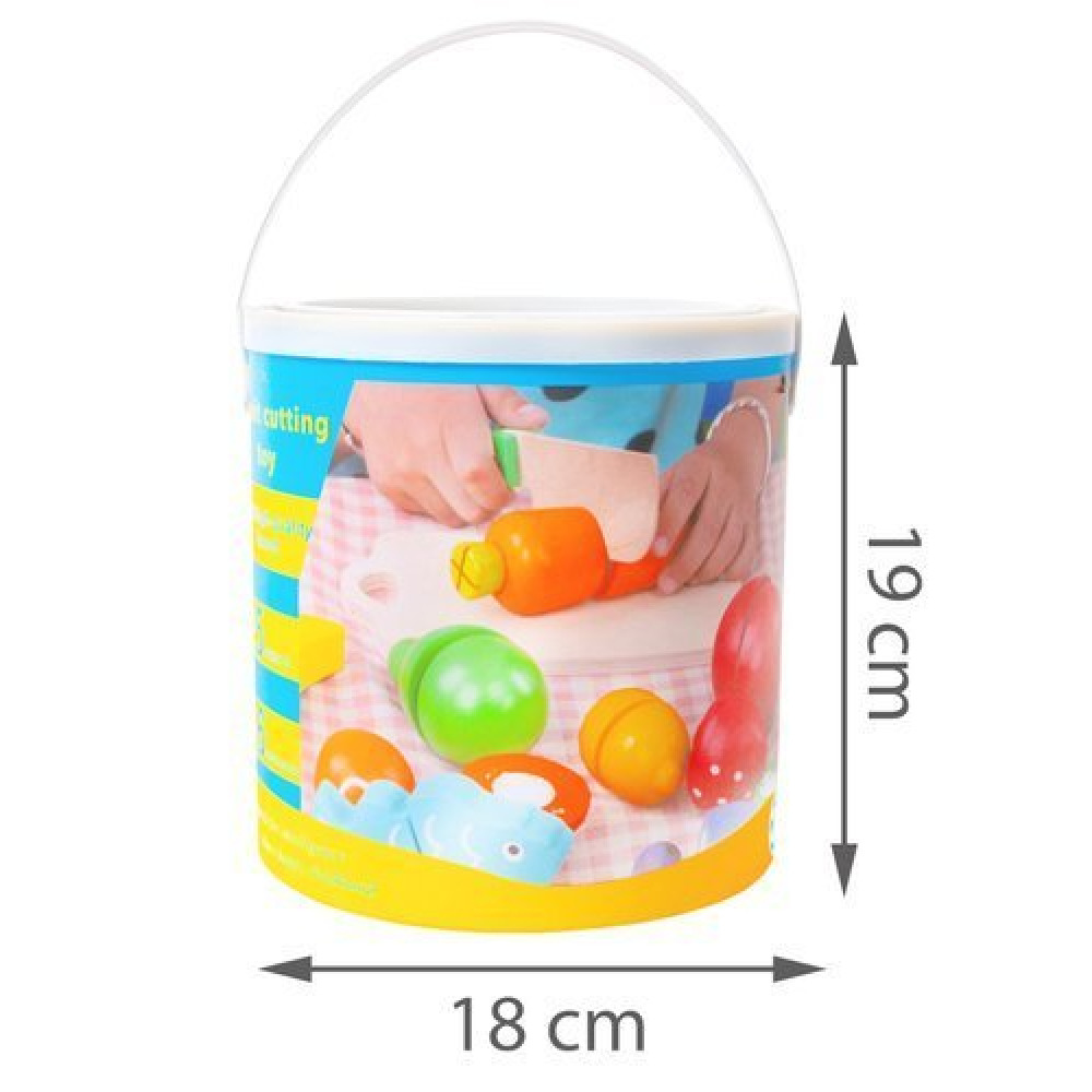 Αυτό το μείγμα φρούτων και λαχανικών έχει πολλά να προσφέρει. Τα διάφορα είδη ξύλινων φρούτων και λαχανικών είναι βαμμένα έτσι ώστε να μοιάζουν με τα πραγματικά και είναι μαζί ενωμένα κομμάτια Velcro. Ένα μαχαίρι παιχνιδιού και μια ξύλινη πλάκα περιλαμβάνονται ως βοηθοί κουζίνας. Είναι μια νόστιμη εμπειρία παιχνιδιού που προάγει επίσης τη δημιουργικότητα και την φαντασία. Όλα μπορούν να αποθηκευτούν με ασφάλεια στο πρακτικό κυλινδρικό δοχείο από σταθερό χαρτόνι και να τα πάρετε μαζί σας παντού.