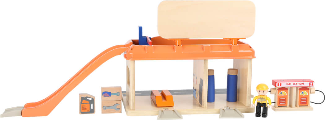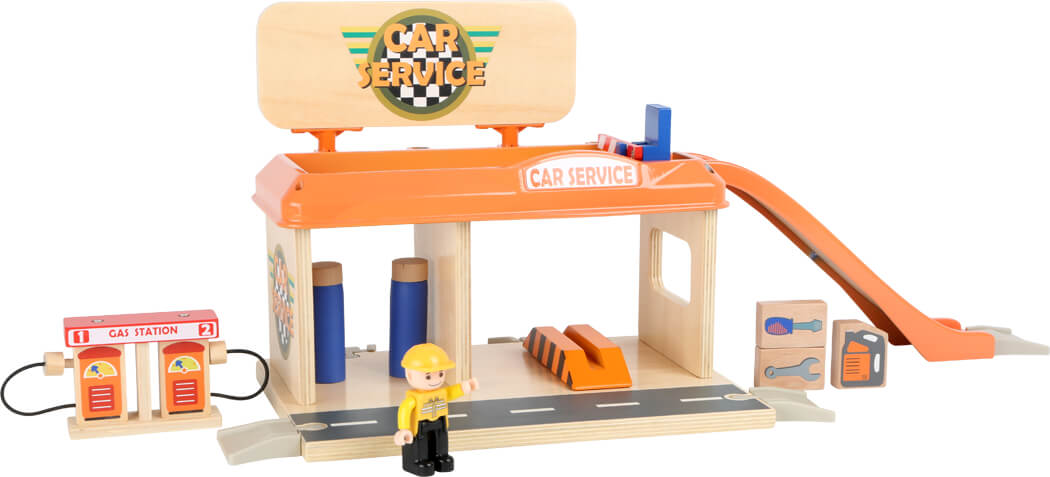 Καλώς ήρθατε στο συνεργείο όπου όλα είναι δυνατά! Το ξύλινο αυτό συνεργείο αυτοκινήτων προσφέρει στους μικρούς μηχανικούς τη δυνατότητα να επισκευάσουν, να καθαρίσουν και να γεμίσουν τα οχήματά τους.