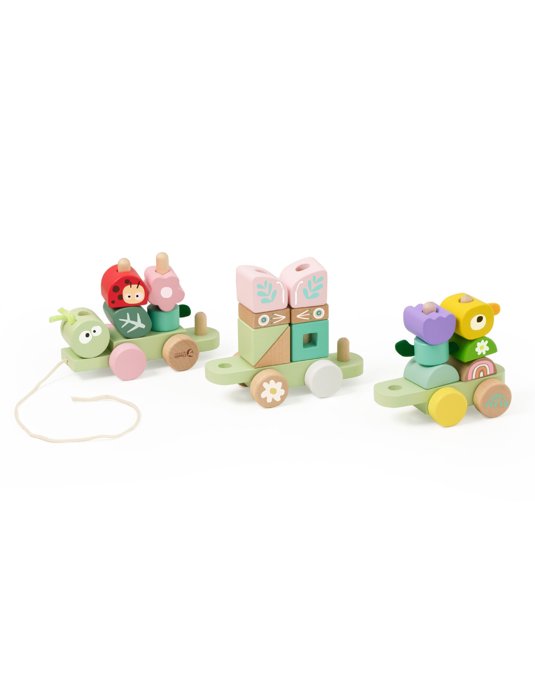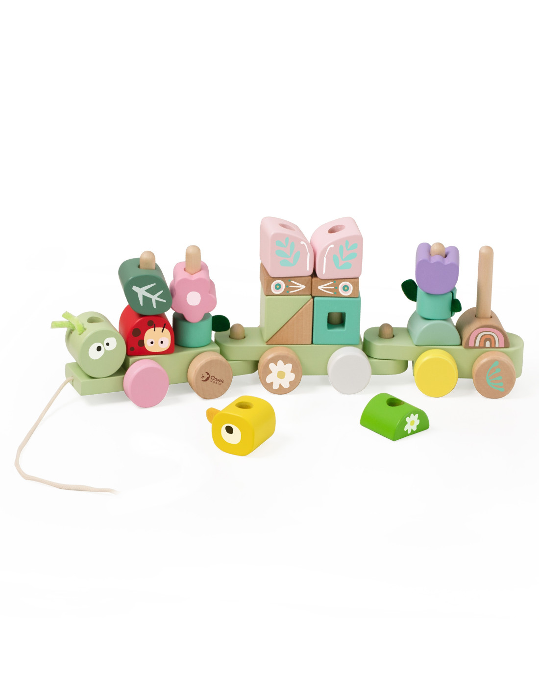 Με 27 κομμάτια και 3 βαγόνια που συνδυάζονται ελεύθερα, τα παιδιά μπορούν να δημιουργούν διαφορετικές συνθέσεις κάθε φορά. Η λειτουργία με κορδόνι επιτρέπει να τραβούν το τρενάκι, προσθέτοντας κίνηση και ενθουσιασμό στο παιχνίδι. Ιδανικό για ατελείωτες ώρες δημιουργικής απασχόλησης.