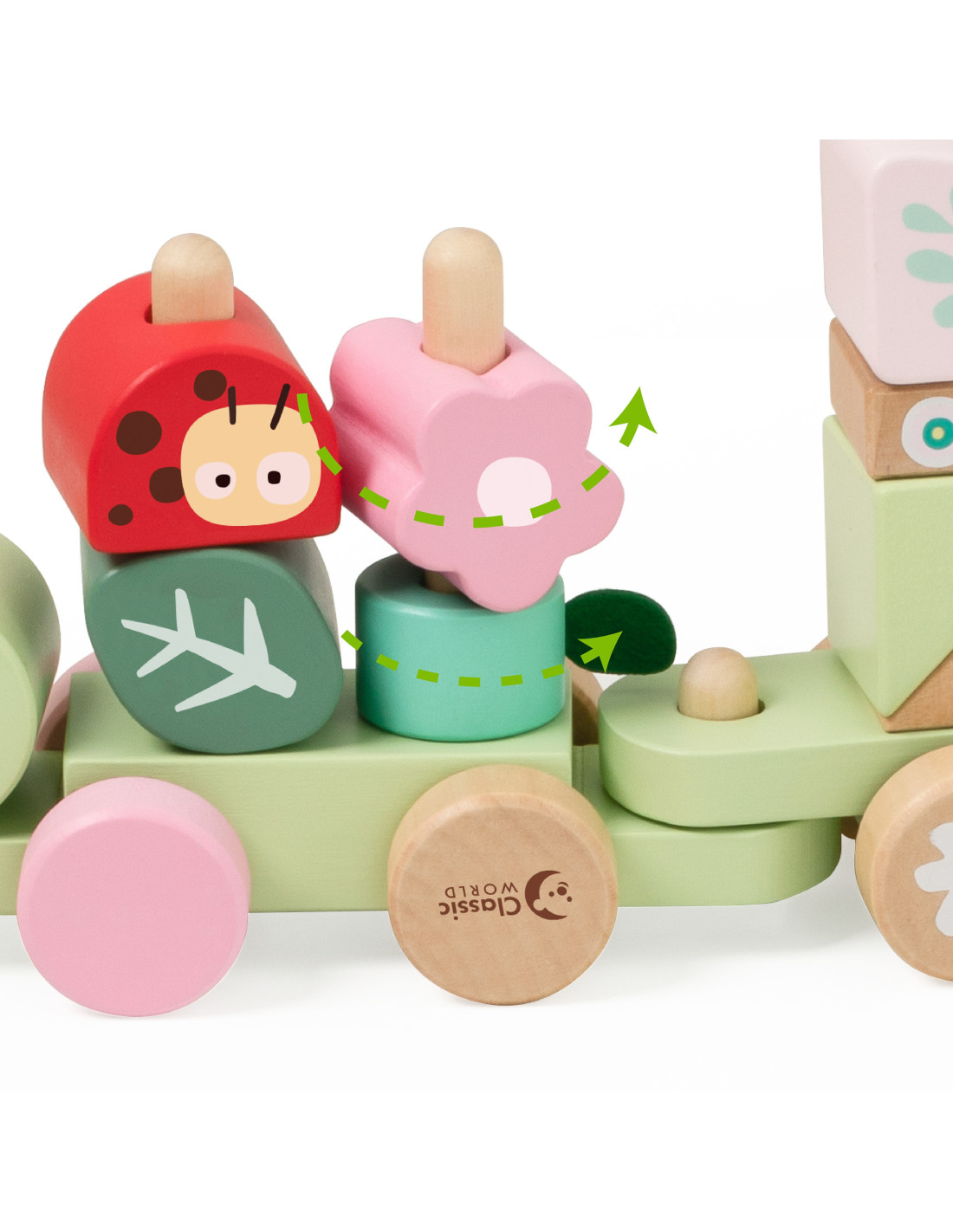 Κατασκευασμένο από υψηλής ποιότητας ξύλο με λείες επιφάνειες, προσφέρει ασφαλές παιχνίδι για παιδιά από 12 μηνών. Ενισχύει τη λεπτή κινητικότητα, τον συντονισμό, τη συγκέντρωση και τη φαντασία, ενώ συμβάλλει στην ανάπτυξη της λογικής σκέψης.