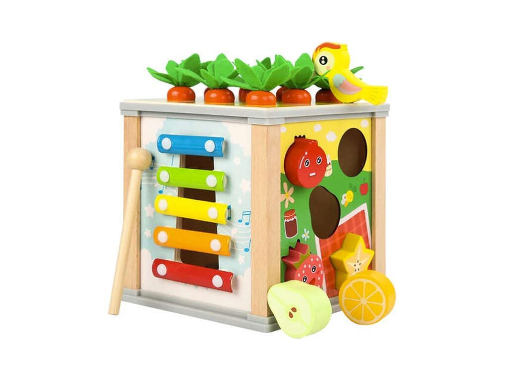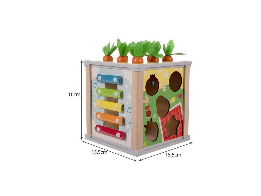Κάθε πλευρά του κύβου φιλοξενεί και μια διαφορετική δραστηριότητα: κύμβαλα, sorter σχημάτων, γρανάζια, ρολόι και παιχνίδι με μαγνητικά σκουληκάκια & καρότα. Το επάνω μέρος ανοίγει εύκολα, ώστε να αποθηκεύονται όλα τα αξεσουάρ μέσα στον κύβο – πρακτικό και οργανωμένο παιχνίδι χωρίς ακαταστασία!
