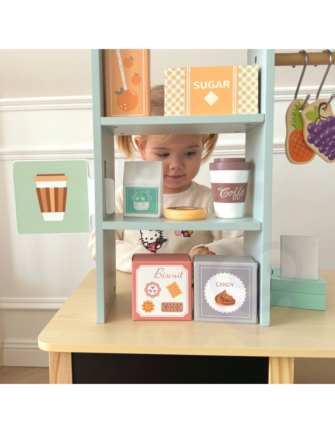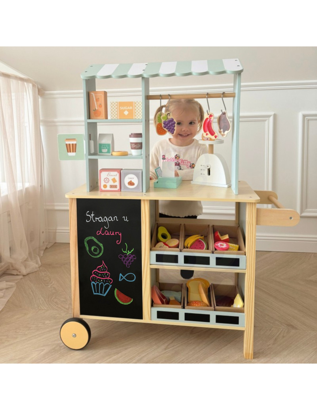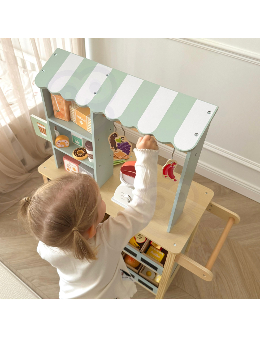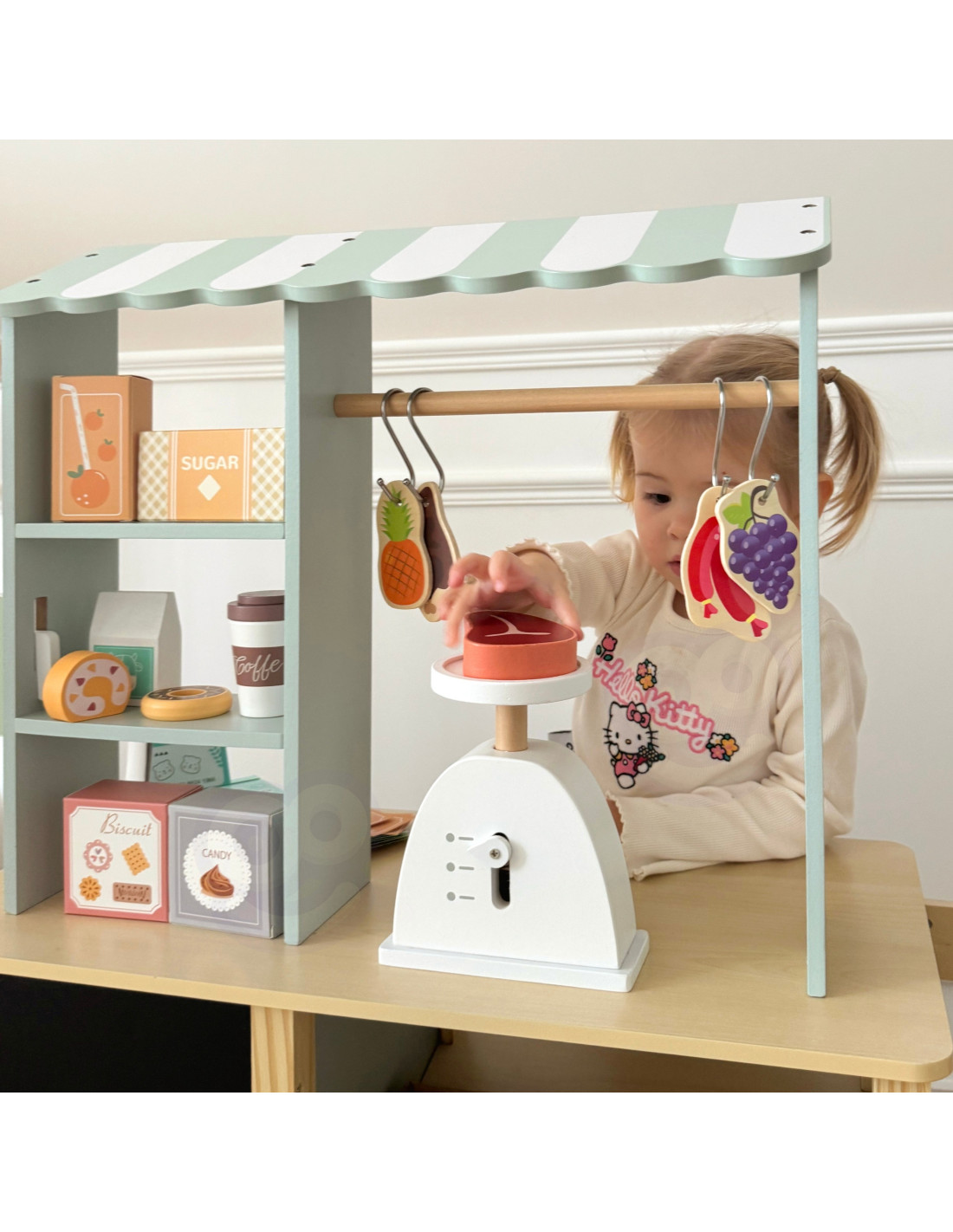 Το σετ περιλαμβάνει ζυγαριά, POS/reader κάρτας, τρόφιμα, κουτιά και μαυροπίνακα για προσφορές και τιμές. Τα παιδιά μπορούν να γράφουν τις “προσφορές της ημέρας”, να ζυγίζουν προϊόντα και να οργανώνουν το δικό τους κατάστημα, αναπτύσσοντας μαθηματικές και οργανωτικές δεξιότητες μέσα από το παιχνίδι.