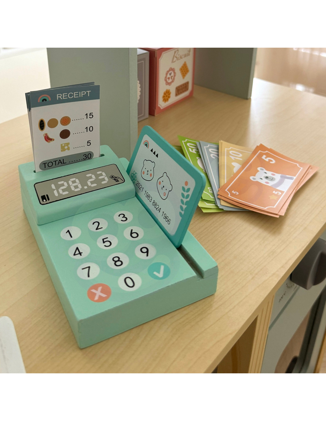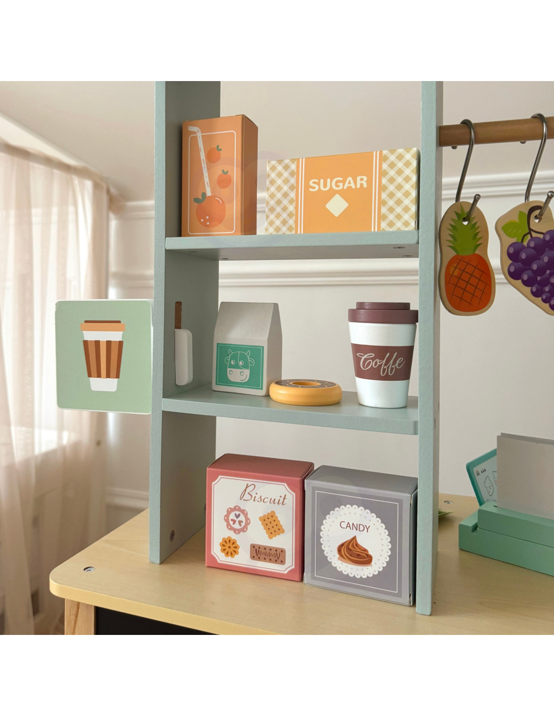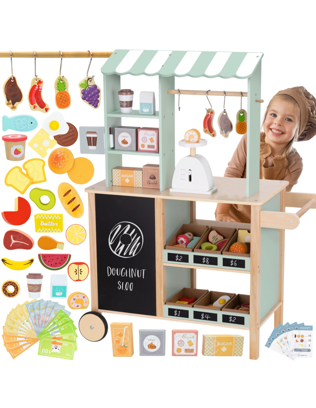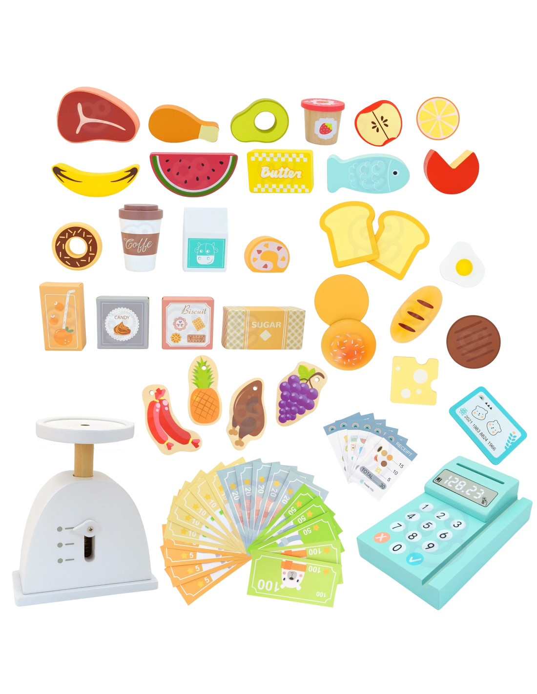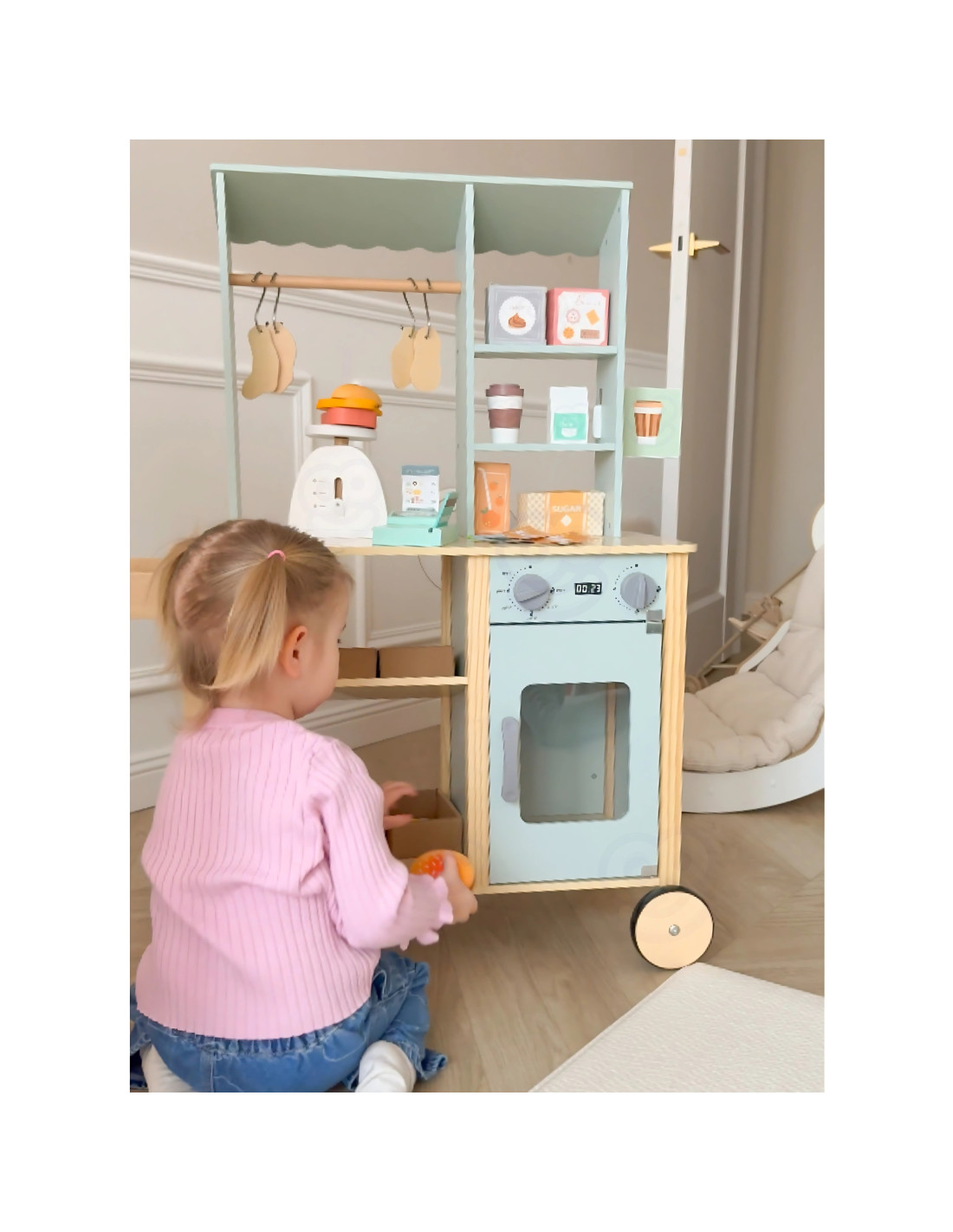 Το σετ περιλαμβάνει ζυγαριά, POS/reader κάρτας, τρόφιμα, κουτιά και μαυροπίνακα για προσφορές και τιμές. Τα παιδιά μπορούν να γράφουν τις “προσφορές της ημέρας”, να ζυγίζουν προϊόντα και να οργανώνουν το δικό τους κατάστημα, αναπτύσσοντας μαθηματικές και οργανωτικές δεξιότητες μέσα από το παιχνίδι.