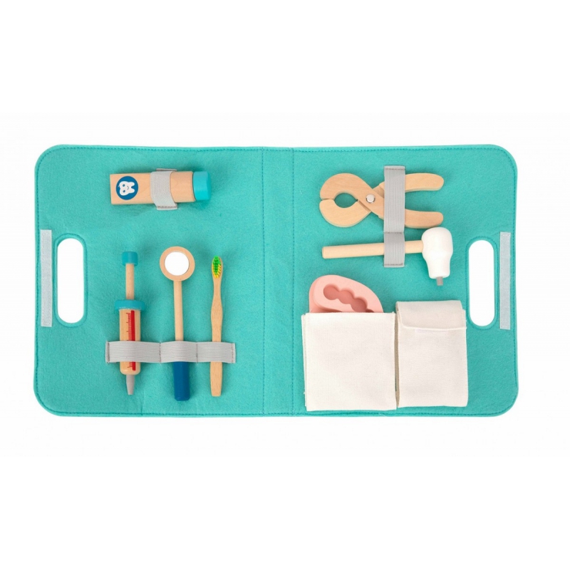 Ξύλινα εργαλεία σε τσάντα για μικρό οδοντίατρο από τη μάρκα TOOKY TOY. Αυτό το σετ περιλαμβάνει όλα όσα χρειάζεται ο μικρός σας γιατρός για να παίξει τον οδοντίατρο. Οι μελλοντικοί γιατροί μπορούν να κάνουν ενέσεις, να εξάγουν και να ελέγχουν την κατάσταση των δοντιών των ασθενών τους. Το Playing Dentist δεν είναι μόνο ένα παιχνίδι ρόλων, αλλά και η εκμάθηση πώς να φροντίζεις την υγιεινή και τις συνέπειες της έλλειψής της. Διδάσκει επίσης την ενσυναίσθηση και τη συμπόνια, κάτι που είναι πολύ σημαντικό στις κοινωνικές σχέσεις.Υποστηρίζει την ανάπτυξη της φαντασίας και διδάσκει την επίλυση προβλημάτων.