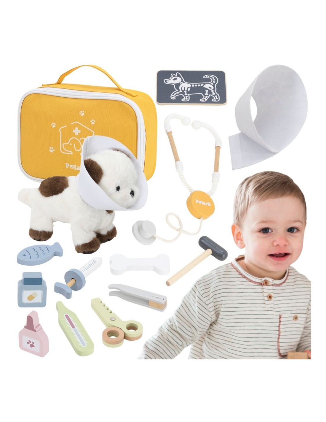 Το σετ περιλαμβάνει στηθοσκόπιο, θερμόμετρο, σύριγγα, ψαλιδάκι, ακτινογραφία, λαβίδα, σφυράκι αντανακλαστικών, κολάρο κατοικιδίου και λιχουδιές. Όλα αποθηκεύονται σε πρακτική τσάντα με φερμουάρ και χερούλι, ιδανική για μεταφορά στο σχολείο, στις εκδρομές ή στο σπίτι φίλων.