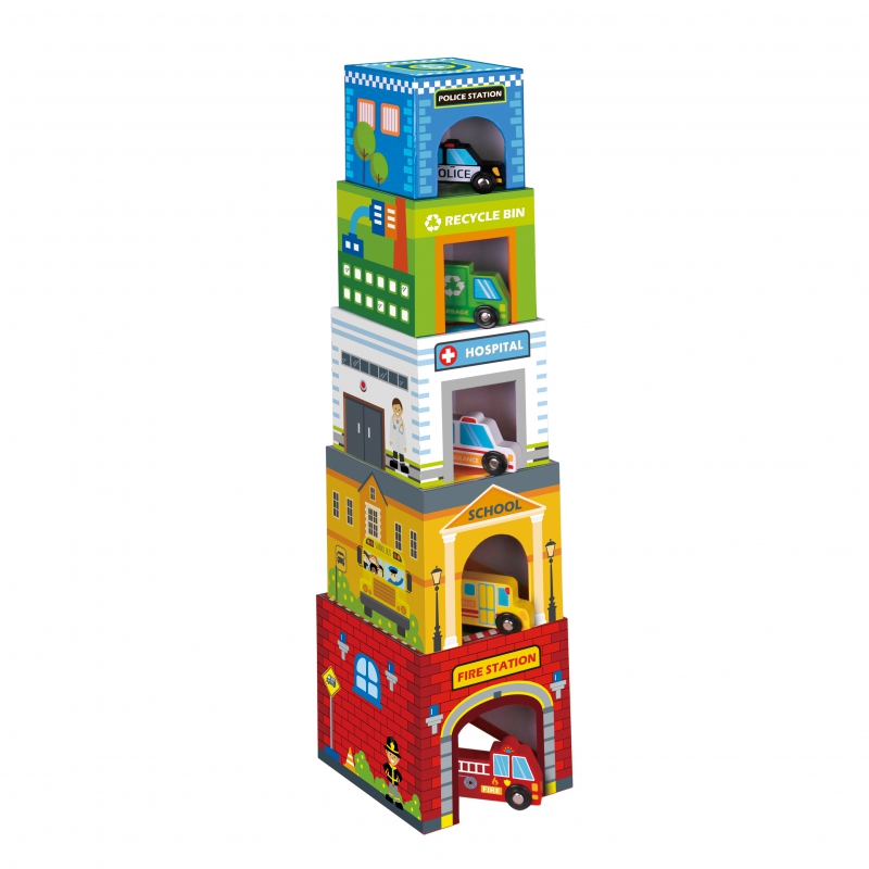 Το παζλ City είναι μια εξαιρετική εναλλακτική στα παραδοσιακά παζλ και μπλοκ. Χάρη στους πολύχρωμους κύβους γεμάτους εικονογραφήσεις, τα παιδιά μπορούν εύκολα να συνδυάσουν τη μάθηση με τη διασκέδαση. Επιπλέον, το σετ περιλαμβάνει ξύλινα οχήματα με ρόδες από καουτσούκ! Το παιδί αποφασίζει τι δομή θα φτιάξει. Τα ζάρια απεικονίζονται με λογικό τρόπο που αναπτύσσει την αντίληψη του παιδιού , π.χ. το μεγαλύτερο έχει τον αριθμό 1 και το μικρότερο τον αριθμό 5. Το παιδί μπορεί εύκολα να μάθει αριθμούς τοποθετώντας τον πύργο από τον μεγαλύτερο στον μικρότερο αριθμό. Βοηθά στη διάκριση οχημάτων και πιο σημαντικών ιδρυμάτων της πόλης, όπως πυροσβεστική, σχολείο ή νοσοκομείο. Τα κουτιά έχουν γραμμένα αγγλικά ονόματα των κτιρίων, τα οποία μπορούν να σας βοηθήσουν να μάθετε αγγλικά αργότερα στη ζωή σας. Οι κύβοι μπορούν επίσης να χρησιμοποιηθούν ως χώρος αποθήκευσης διαφόρων αντικειμένων , όπως κραγιόνια ή στυλό. Το παιδί μπορεί να διασκεδάσει και να φανταστεί τη ζωή στην πόλη και να τονώσει τη δημιουργικότητα δημιουργώντας διαφορετικές ιστορίες. Το παιχνίδι δεν περιέχει αιχμηρές άκρες και είναι βαμμένο με μη τοξικά χρώματα που είναι ασφαλή για το παιδί σας.