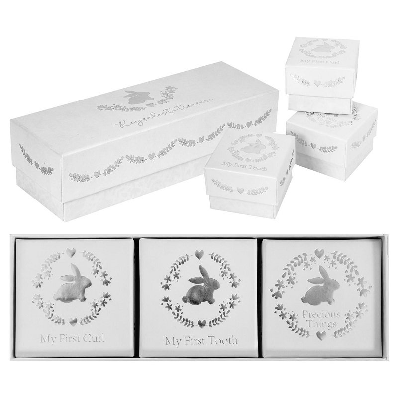 Με επένδυση από λευκό ιριδίζον χαρτί και λεπτομέρειες σε ασημί foil, τα κουτιά αποπνέουν κομψότητα και διαχρονικότητα. Ο χαριτωμένος σχεδιασμός με λαγουδάκι προσθέτει μια παιχνιδιάρικη νότα που ταιριάζει σε κάθε παιδικό δωμάτιο ή διακόσμηση.